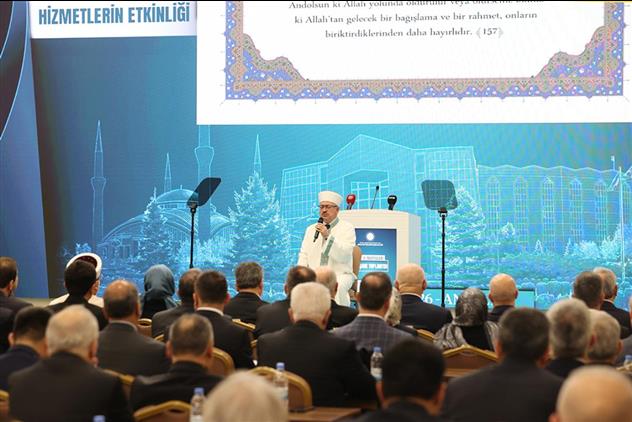 “Hizmetlerimizin bir diğer boyutu da kurumsal kapasitemizdir. Personel Yönetim Hizmetleri oturumunda, teşkilatımızın en büyük gücü olan insan kaynağımızı konuşacağız. Çalışanlarımızın motivasyonunu artırmak, liyakati ve adaleti tesis etmek, personelimizin aidiyet bilincini güçlendirmek boynumuzun borcudur. Ayrıca Hukukun üstünlüğünden taviz vermeden, Denetim Hizmetlerimizi rehberlik eksenli bir anlayışla sürdürmek gerekiyor. Hizmet kalitemizi ve yelpazemizi genişletmek için mevzuat altyapımızı sürekli güncel ve güçlü tutmak zorundayız. İnşaat Hizmetleri oturumunda, camilerimizi ve hizmet binalarımızı sadece namaz kılınan ve dini bilgi öğrenilen mekanlar değil, hayatın merkezi olan külliyeler olarak nasıl planlayacağımızı istişare etmek durumundayız. Strateji Hizmetleri ile de kaynaklarımızı israf etmeden, en verimli şekilde milletimizin hizmetine sunmanın yollarını arayacağız. Kurumumuzun hizmet ufkunu genişletmek, geçmişin tecrübesini geleceğin vizyonuyla buluşturmak zorundayız. Değişen dünya, dinamik, kuşatıcı ve öngörülü bir stratejik planlamayı zorunlu kılmaktadır.”