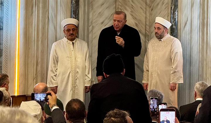 Burada bayram tebrik konuşması gerçekleştiren Cumhurbaşkanı Erdoğan, "Başı rahmet, ortası mağfiret, sonu ebedi azabından kurtuluş olan mübarek Ramazan-ı Şerif'i geride bıraktık ve bugün Ramazan Bayramı'yla müşerref olduk. Rabb'im Ramazan Bayramı'nın tüm alemi İslam için bir kurtuluşa, bir dirilişe vesile olmasını bizlere nasip eylesin. Ramazan Bayramı'nı da ülkemiz, milletimiz için hayırlara vesile kılsın." dedi.